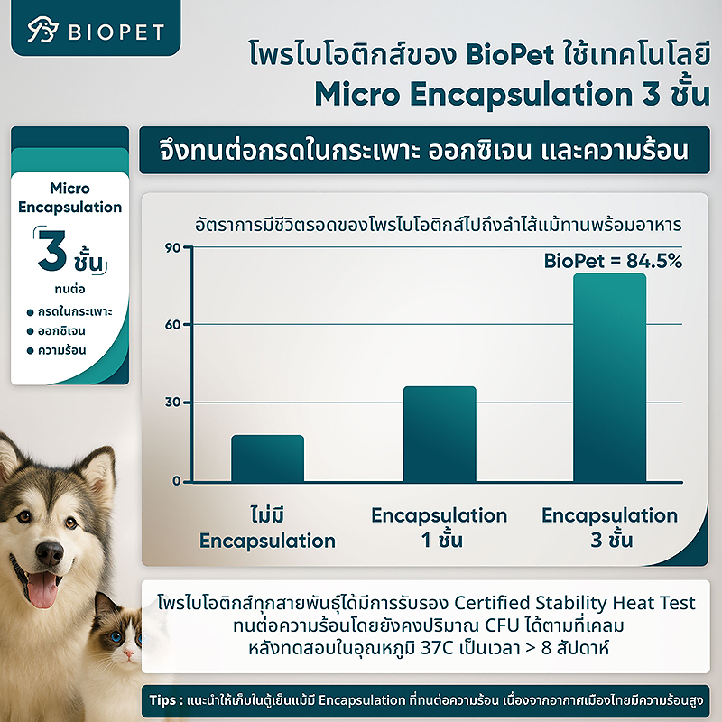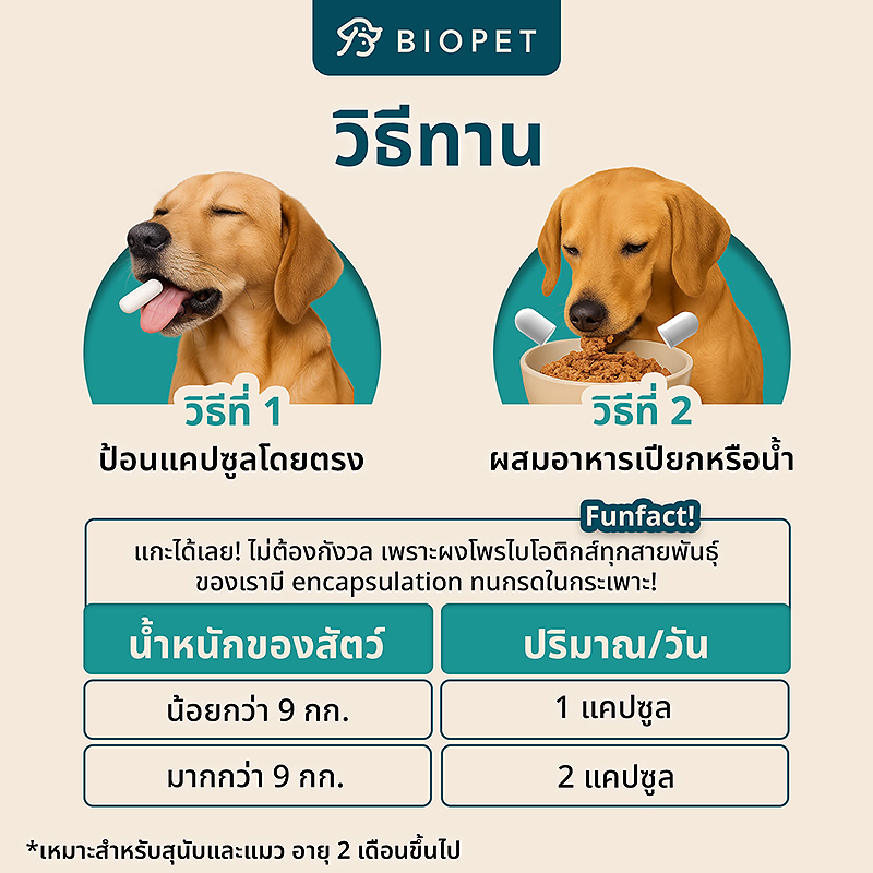 | ควรให้สัตว์เลี้ยงรับประทานอย่างไร? | ช่วงก่อนนอน หรือ 2 ชั่วโมงก่อนหรือหลังมื้ออาหาร หรือแกะแคปซูลโรย/ผสมผงบนอาหาร หากสัตว์เลี้ยงไม่กลืนแคปซูล (ผงโพรไบโอติกส์เคลือบกันกรดมาแล้ว)