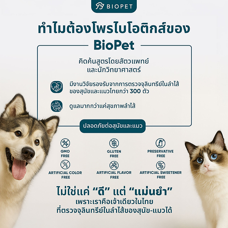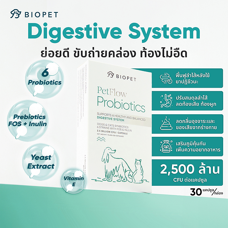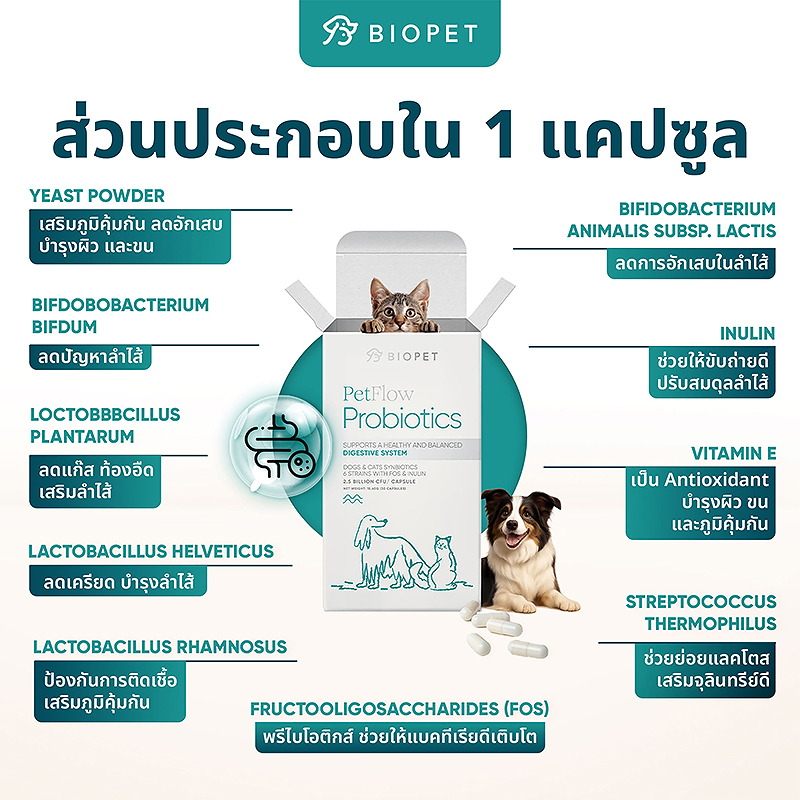 โพรไบโอติกส์ + พรีไบโอติกส์ สำหรับดูแลระบบย่อยอาหารและการขับถ่ายของสัตว์เลี้ยง ช่วยบรรเทาอาการท้องเสีย ท้องผูก ท้องอืด และช่วยให้ระบบย่อยอาหารทำงานได้มีประสิทธิภาพมากขึ้น